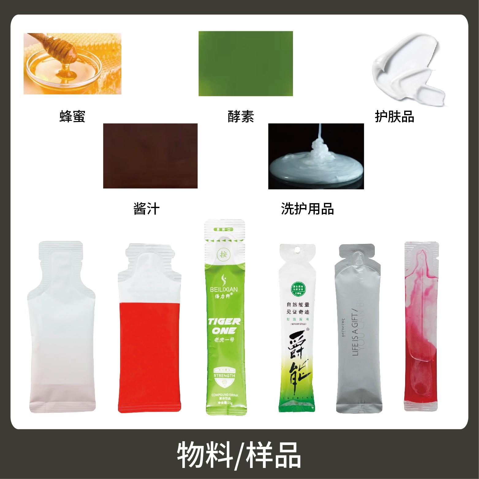 適用于各行業(yè)中酵素、果汁、漱口水、洗護(hù)用品、染發(fā)劑、化妝品小樣等醬料、液體物品的多列異形袋計(jì)量包裝。